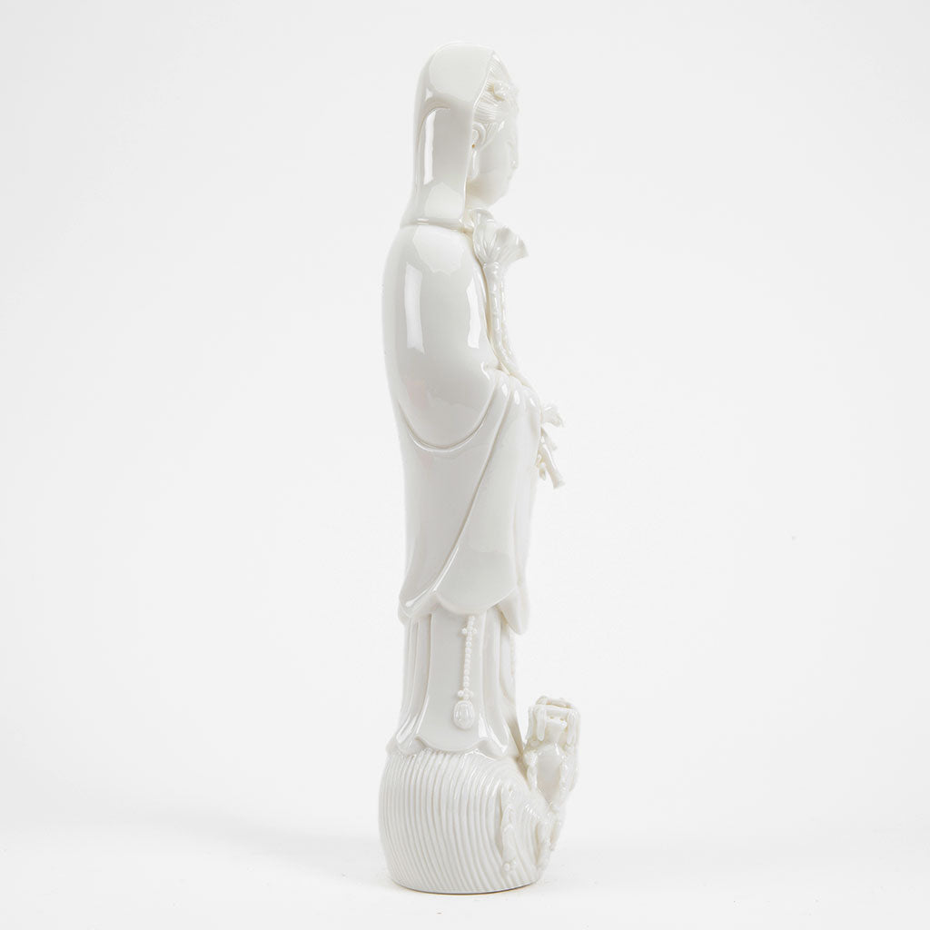 This Kuan Yin fountain showcases the Bodhisattva of Compassion standing gracefully, radiating serenity and peace. The statue, rendered in a soft white finish, features intricate details from her flowing robes to the delicate lotus base she stands upon, symbolizing purity and enlightenment.