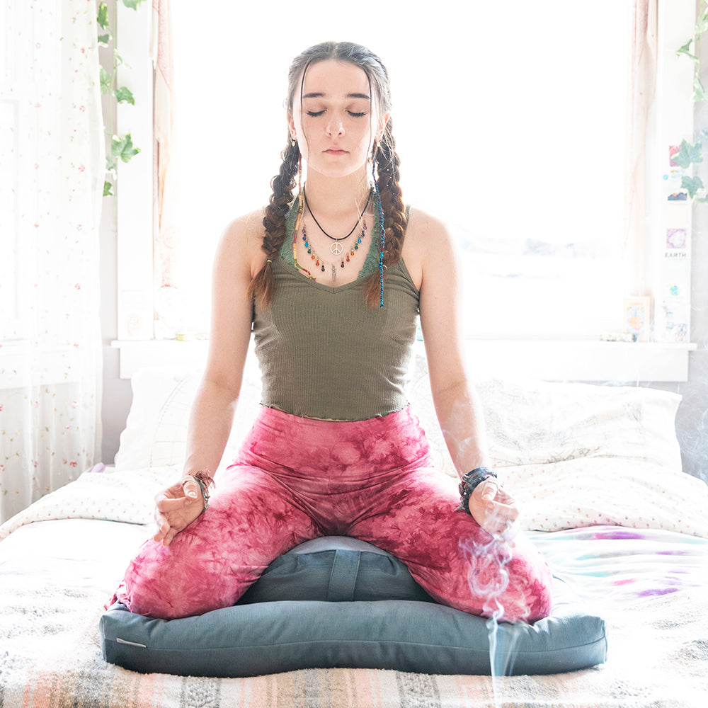 The goal of meditation is to connect the mind, body, and spirit. By taking these moments out of our day, we eventually unlock an inner sense of self-awareness of our emotional wellbeing and greater mindfulness- the ability to be present in the current moment. In order to do this, though, our bodies must be in a state of physical comfort and ease. Zafu and zabuton meditation cushion sets are specifically designed for the purpose of making seated meditation more comfortable. Although any seat or cushion will do to start with, we highly recommend getting your own meditation cushion set (or at least a zabuton floor pillow) if you plan on making meditation a consistent part of your life. These cushions are specifically designed to increase comfort during seated meditation and yoga poses. Keep reading to learn about the traditional sitting meditation positions. All of these poses have wonderful spiritual and physical benefits. If you’re looking to learn more about how to get into the meditative mindset, click here.