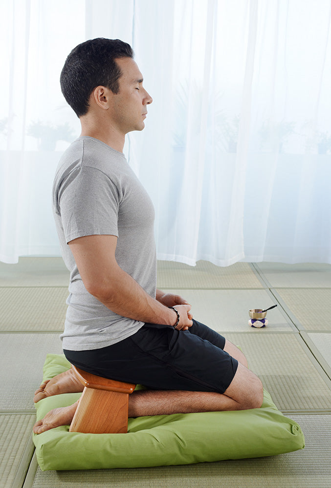 Unlike the other meditation positions on this list, seiza pose comes from Japan. Seiza (pronounced say’-zah) has been the formal way of sitting since ancient times in Japan and is now, in the modern day, practiced in traditional ceremonies and settings there. It is attained by kneeling on the knees and resting the buttocks on the feet while keeping the back straight and upright. This position is believed to be great for improving flexibility and posture over time. It is common, especially for Westerners who are not accustomed to sitting on the floor for extended periods of time, to use a zafu and zabuton meditation cushion set or a meditation bench as a seat while practicing seiza in order to prevent ankle and knee pain. Our Hi-Zafu cushions in studio or organic are also great for those who want the comfort and flexibility of a zafu cushion while practicing seiza meditation pose, but are a bit less flexible and/or need extra support.