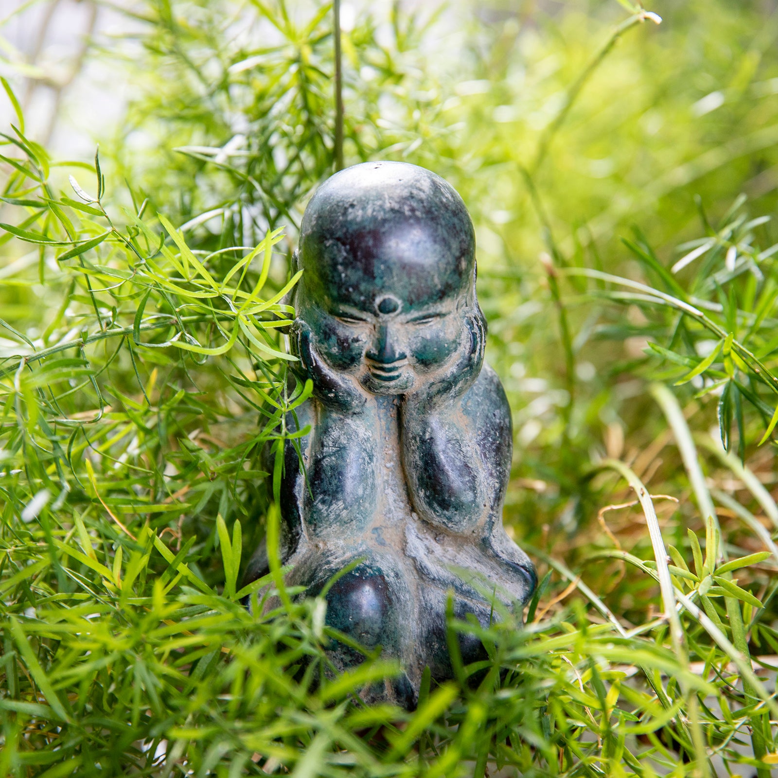 Jizo is the protector of women, children and travelers in the six realms of existence. This brass Jizo with a green patina finish is deep in content contemplation, with both hands to his face.