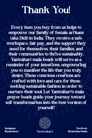 Every mala purchase supports a family of female artisans, known as Didi, in India. These skilled artisans receive fair wages, a safe workspace, and the resources needed to uplift themselves, their families, and their communities. Your support helps sustain ethical craftsmanship and meaningful opportunities, empowering women to thrive.
