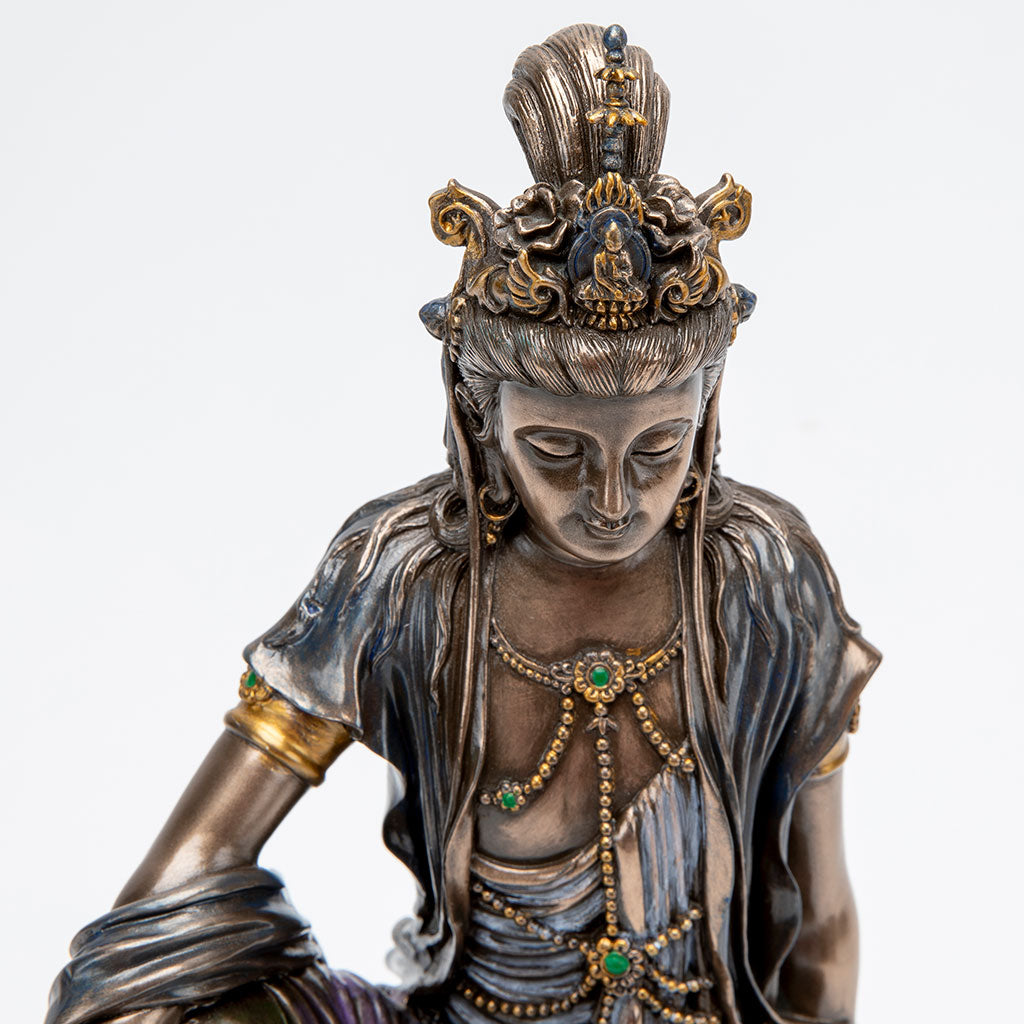Stately, elegant, and richly detailed, this Royal Ease Kuan Yin Heart Sutra Statue is a breathtaking work of art. She sits in quiet contemplation atop a rocky pedestal while assuming the dignified royal ease (rajalilasana) pose, a symbol of her elevated consciousness and divine power, which is further indicated by her copious gold jewelry. Beneath her is multiple lotus flowers, blooming up toward the graceful goddess.