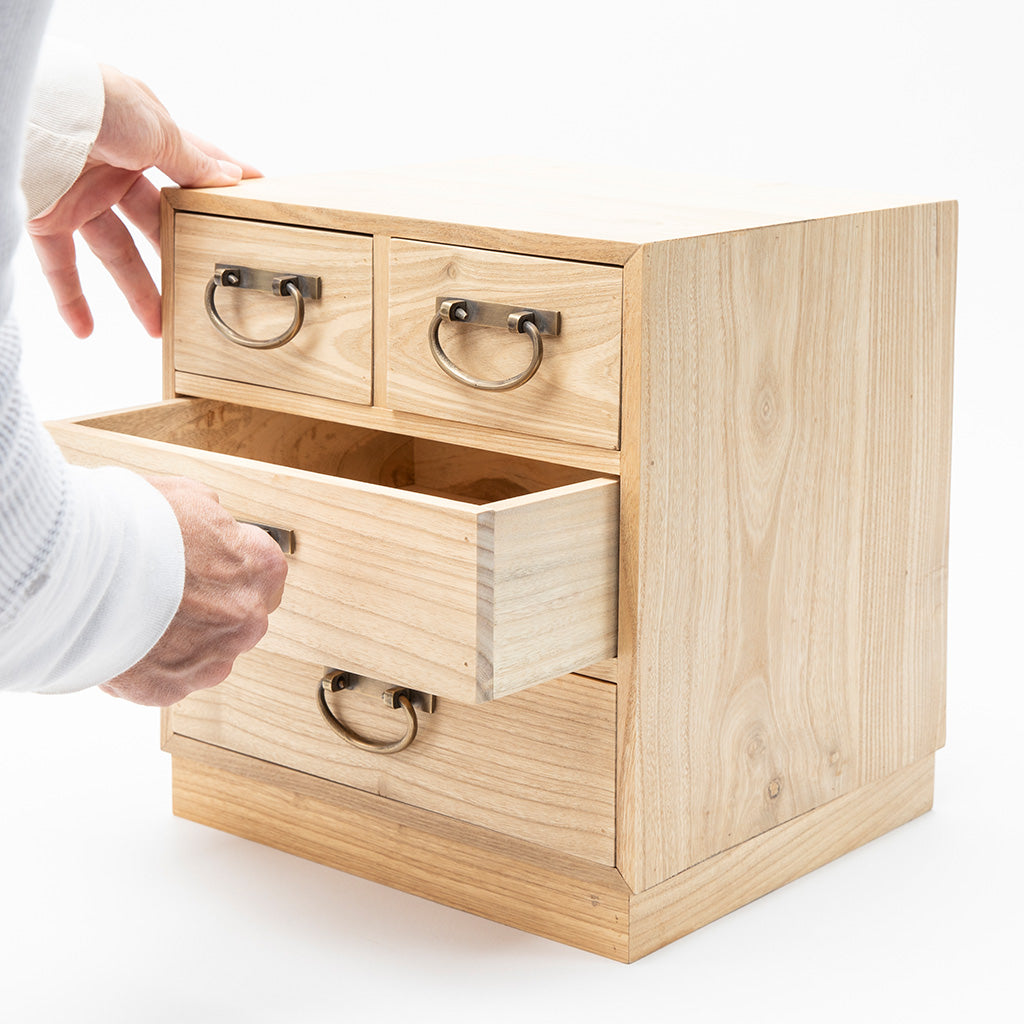The small Four Drawer Japanese Tansu marries form with function as an attractive yet practical piece of storage. It features unfinished sanded wood, 4 drawers, and modern silver hardware for a uniquely simple aesthetic.