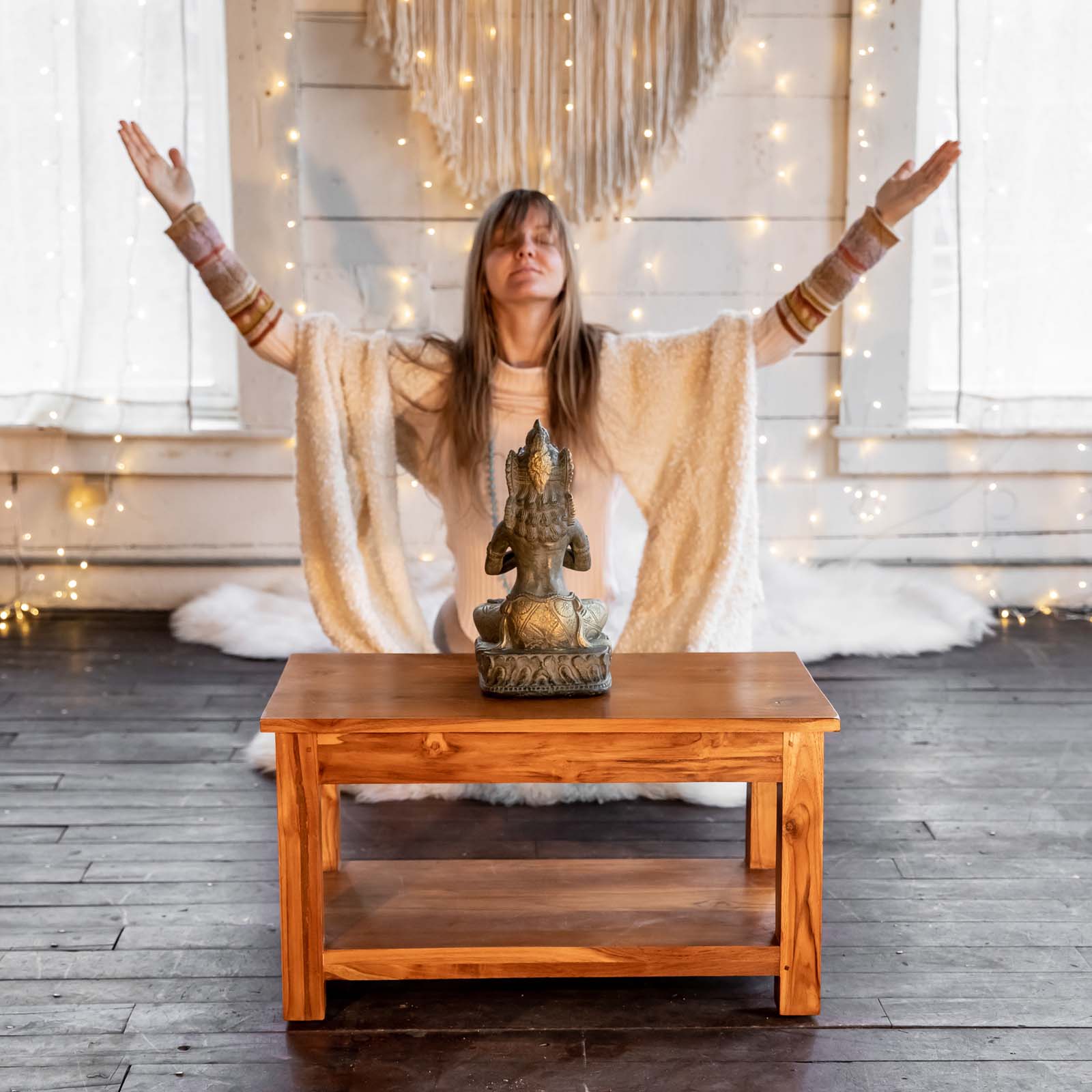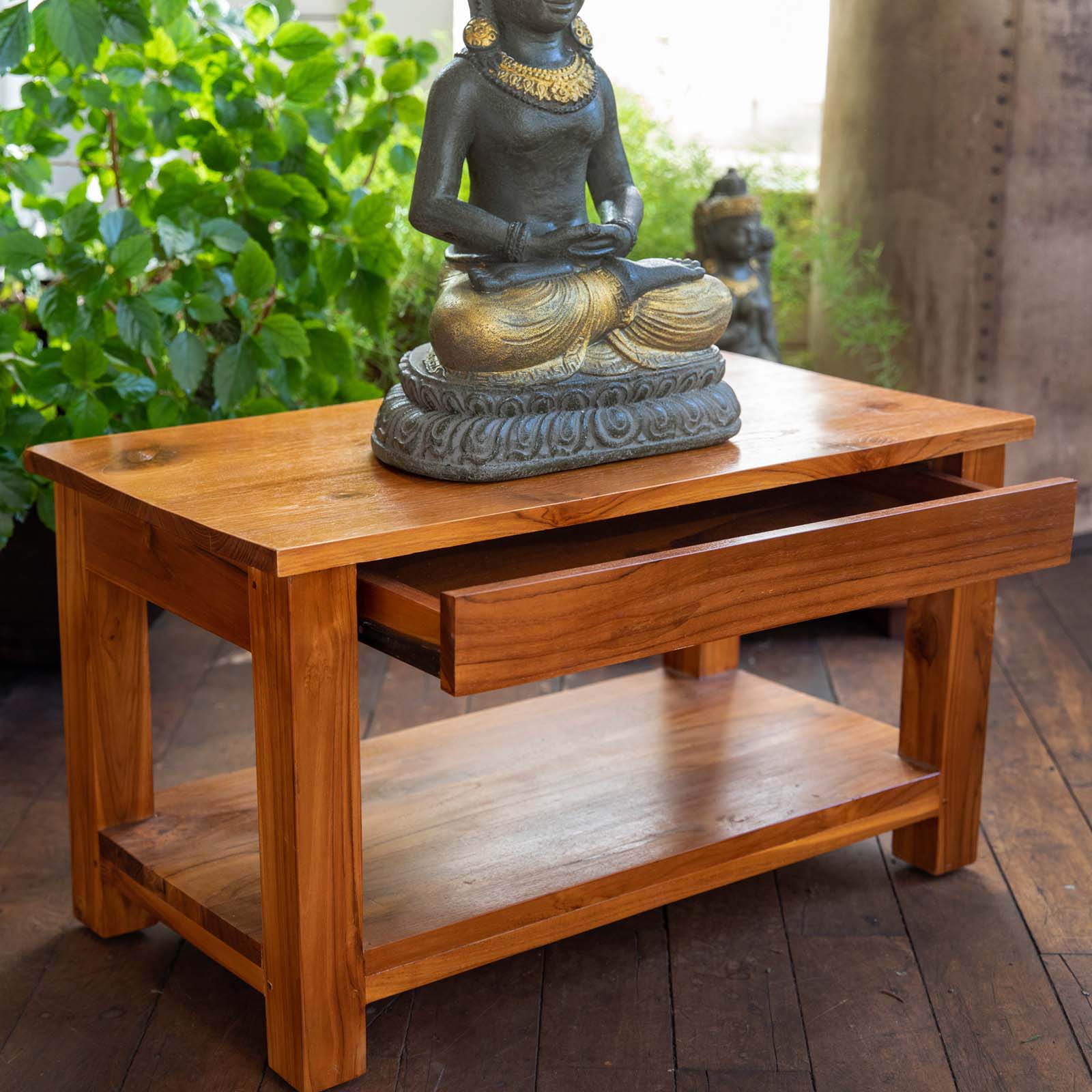 Create a beautiful and functional meditation space with our teak altar table. Teak is an extremely durable wood, which is naturally pest-resistant. This altar is the perfect size to hold a statue, incense bowl, or other meditation supplies. Store small items and extra supplies out of sight in the sliding drawer to keep your space looking uncluttered and serene.